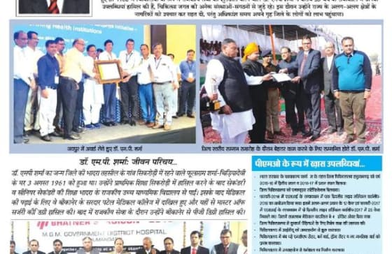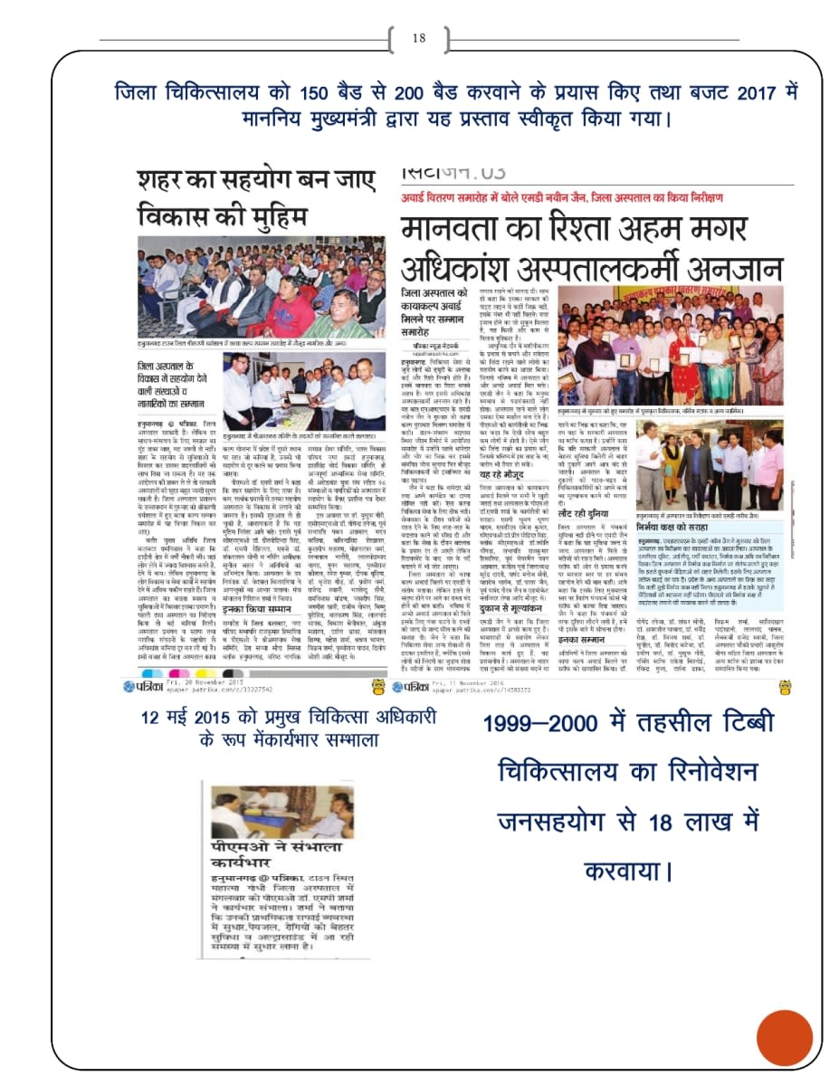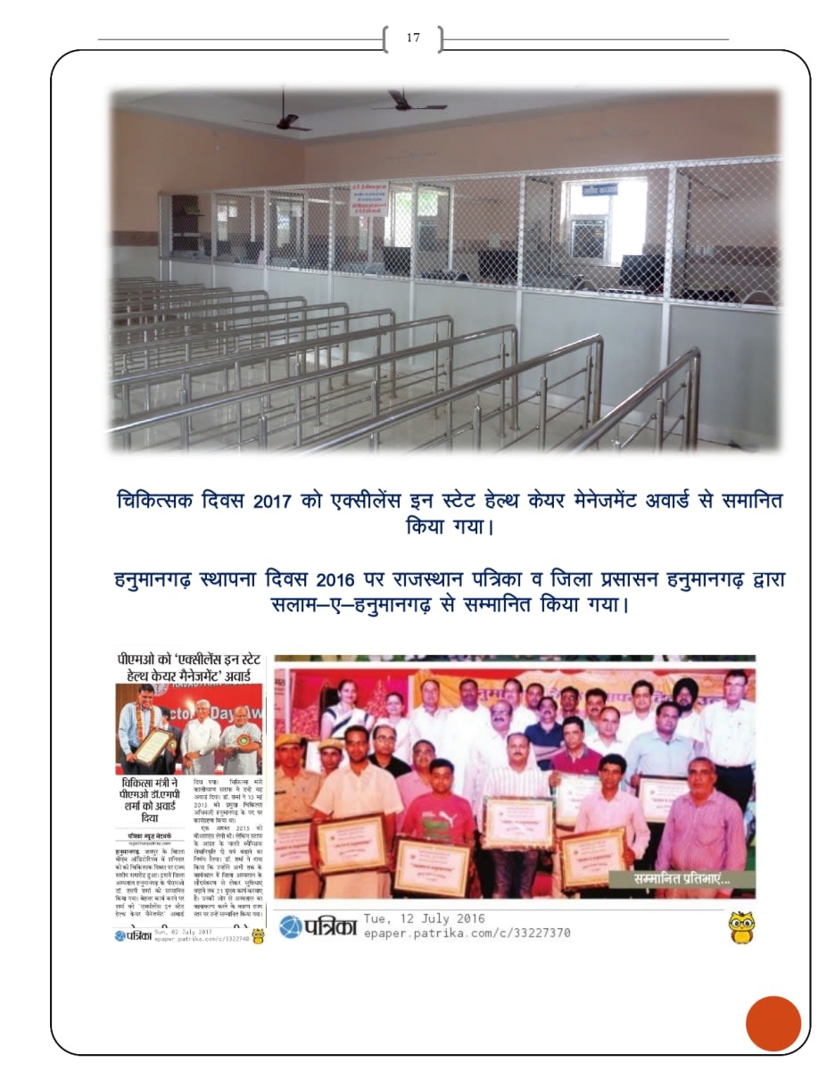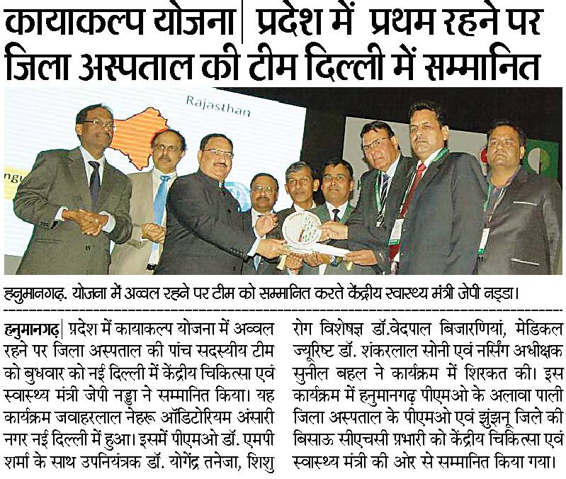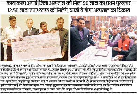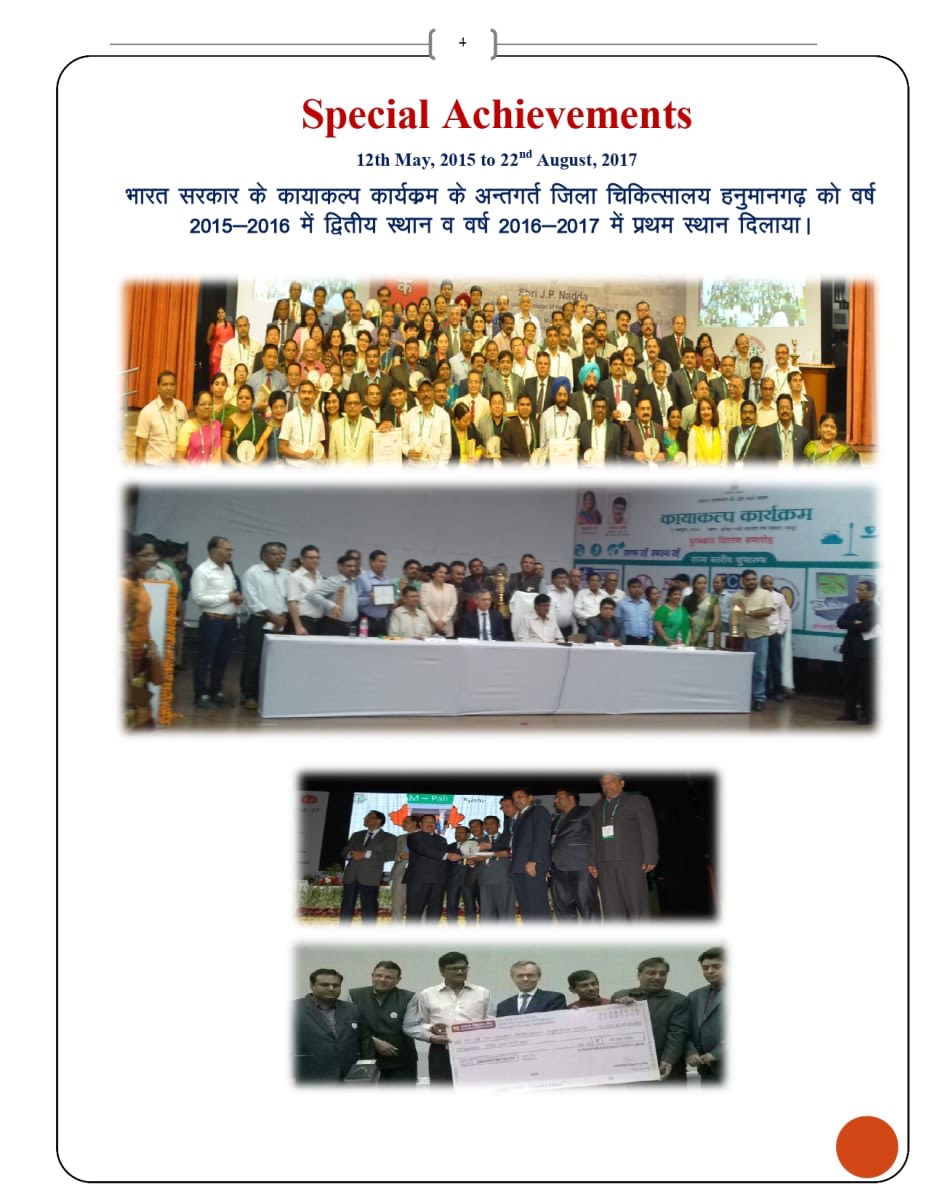 - भारत सरकार के कायाकल्प कार्यक्रम के अन्तगर्त जिलाचिकित्सालय हनुमानगढ़ को वर्ष 2015- 2016 में द्वितीय स्थान व वर्ष 2016- 2017 में प्रथम स्थान दिलाया।