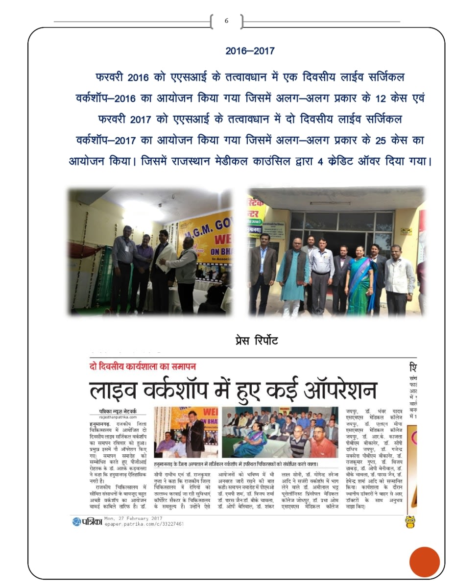 - - फरवरी 2016 को एएसआई के तत्वावधानमें एक दिवसीय लाईव सर्जिकल वर्कशॉप- 2016 का आयोजन किया गया जिसमें अलग- अलग प्रकार के 12 केस एवं फरवरी 2017 को एएसआई के तत्वावधान में दो दिवसीय लाईव सर्जिकल वर्कशॉप- 2017 का आयोजन किया गया जिसमें अलग- अलगप्रकार के 25 केस का आयोजन किया।जिसमें राजस्थान मेडीकल काउंसिल द्वारा 4 क्रेडिट ऑवर दिया गया।