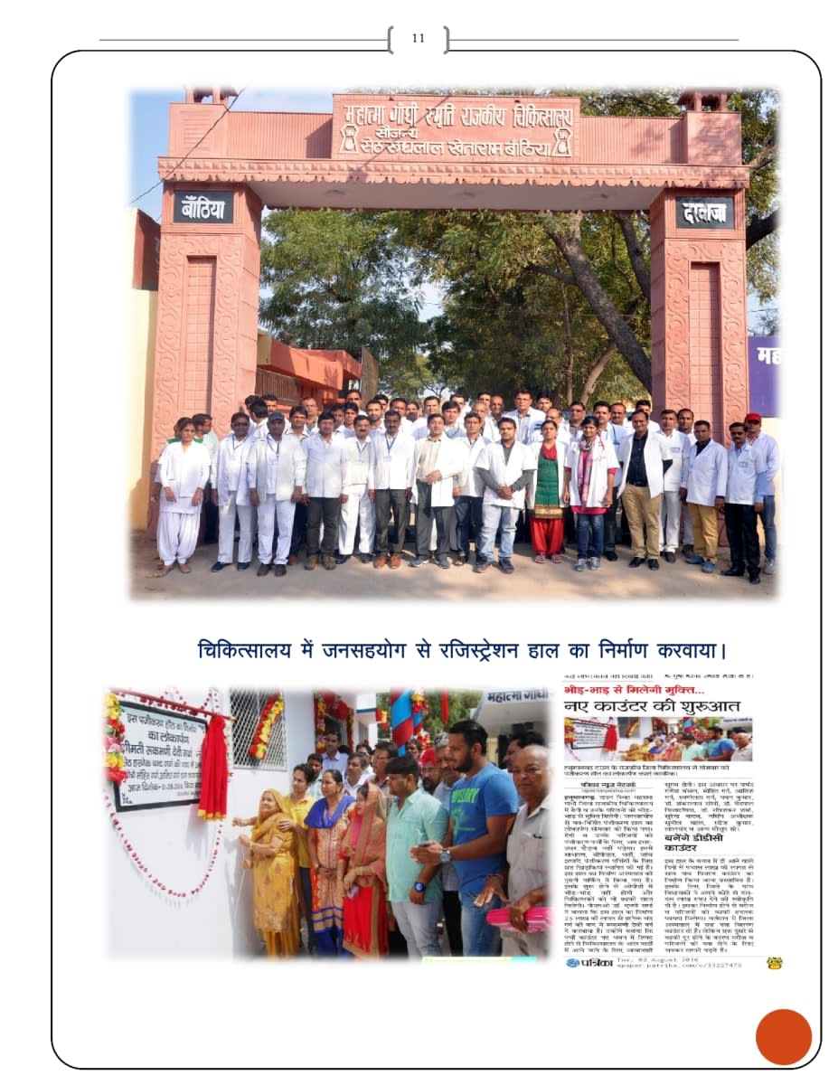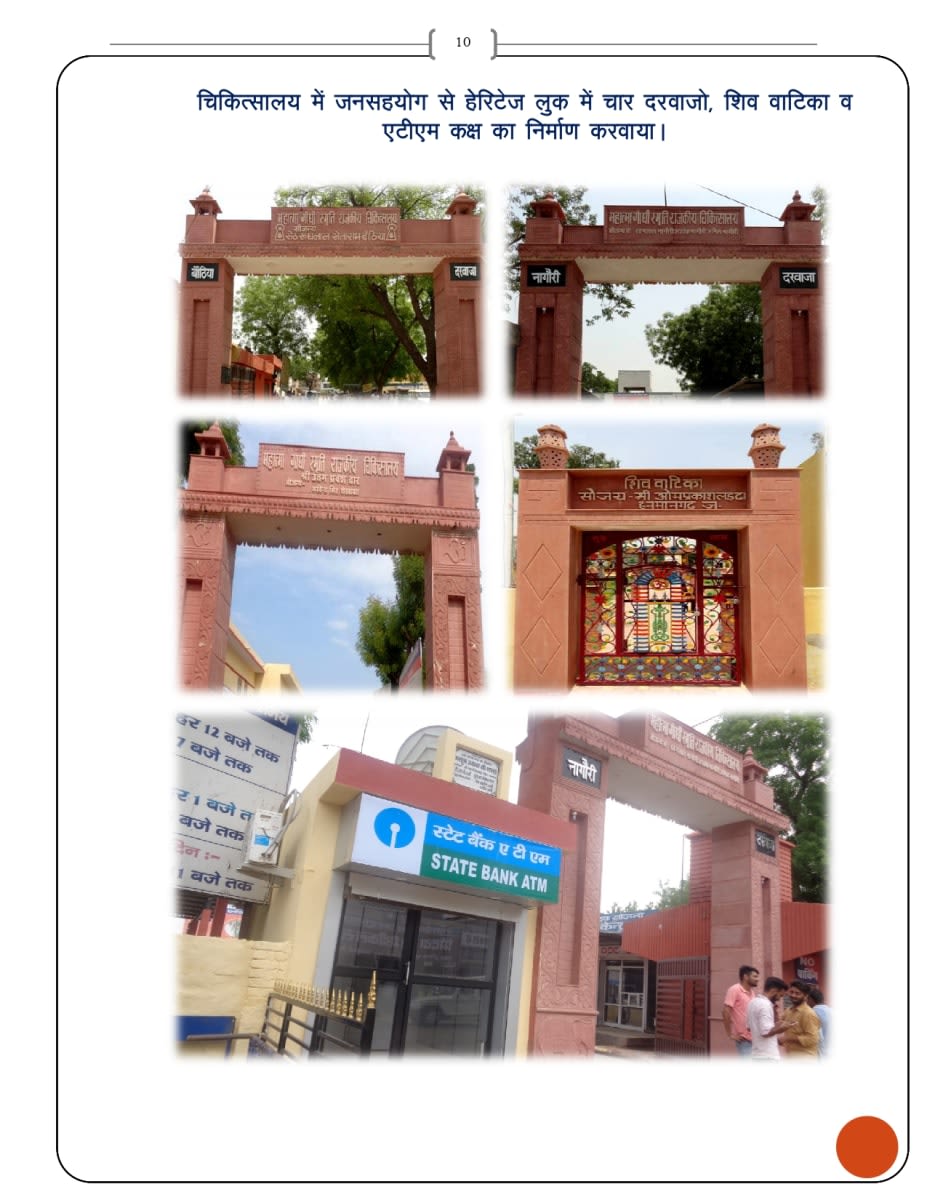 - - चिकित्सालय में जनसहयोग से हेरिटेज लुक में चार दरवाजो, शिववाटिका वएटीएम कक्ष का निर्माण करवाया।