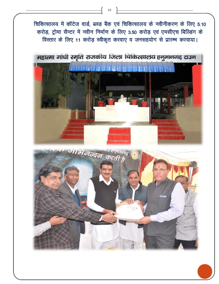 - - चिकित्सालय मेंकॉटेजवार्ड ब्लडबैंक एवंचिकित्सालय के नवीनीकरण के लिए 5.10 करोड़ ट्रोमा सैन्टर में नवीन निर्माण के लिए 3.50 करोड़ एवं एमसीएचबिल्डिंग केविस्तार के लिए 11 करोड़ स्वीकृत करवाए व जनसहयोग से प्रारम्भ करवाया।